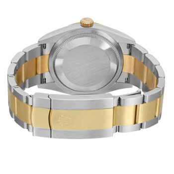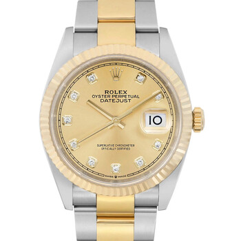 Silver-tone stainless steel case with a two-tone (silver-tone and yellow gold-tone) 18kt yellow gold and stainless steel oyster bracelet. Fixed yellow gold-tone 18kt yellow gold bezel. Champagne dial with yellow gold-tone hands and diamond hour markers. Minute markers around the outer rim. Dial Type: Analog. Date display at the 3 o'clock position. Rolex Calibre 3235 Automatic movement, based upon Rolex 3035, containing 31 Jewels, bitting at 28800 vph, and has a power reserve of approximately 70 hours. Scratch resistant sapphire crystal. Screw down crown. Solid case back. Round case shape, case size: 41 mm, case thickness: 12 mm. Band width: 15.5 mm, band length: 7 inches. Fold over clasp. Water resistant at 100 meters / 330 feet. Functions: date, hour, minute, second, chronometer. Datejust Series. Luxury watch style. Watch label: Swiss Made. Pre-owned Rolex Datejust Automatic Chronometer Diamond Champagne Dial Men's Watch 126233 CDO.