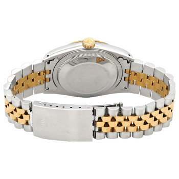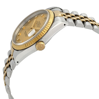 Silver-tone 18kt yellow gold and stainless steel case with a 18kt yellow gold and stainless steel jubilee bracelet. Fixed fluted 18kt yellow gold gold-tone 18k yellow gold bezel. Champagne dial with gold-tone hands and diamond hour markers. Minute markers around the outer rim. Dial Type: Analog. Date display at the 3 o'clock position. Rolex Calibre 3135 Automatic movement, containing 31 Jewels, bitting at 28800 vph, and has a power reserve of approximately 48 hours. Scratch resistant sapphire crystal. Screw down crown. Solid case back. Round case shape, case size: 36 mm. Band length: 7 3/4 inches. Water resistant at 100 meters / 330 feet. Functions: hours, minutes, seconds, date. Datejust Series. Luxury watch style. Watch label: Swiss Made. Pre-owned Rolex Datejust Automatic Diamond Champagne Dial Men's Watch 16233CDJ-1.