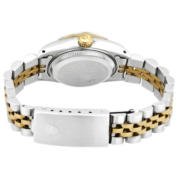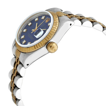 Gold-tone stainless steel case with a 2- tone yellow gold and stainless steel 18kt yellow gold and stainless steel jubilee bracelet. Fixed fluted gold-tone 18kt yellow gold bezel. Blue dial with gold-tone hands and diamond hour markers. Minute markers around the outer rim. Dial Type: Analog. Date display at the 3 o'clock position. Rolex Calibre 2135 Automatic movement, containing 29 Jewels, bitting at 28800 vph, and has a power reserve of approximately 42 hours. Scratch resistant sapphire crystal. Screw down crown. Round case shape, case size: 26 mm. Band length: 5 3/4 inches. Oyster clasp. Water resistant at 100 meters / 330 feet. Functions: hours, minutes, seconds, date. Datejust Series. Luxury watch style. Watch label: Swiss Made. Pre-owned Rolex Datejust Automatic Diamond Ladies Watch 69173BLSJ.