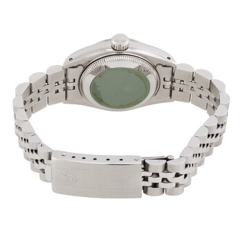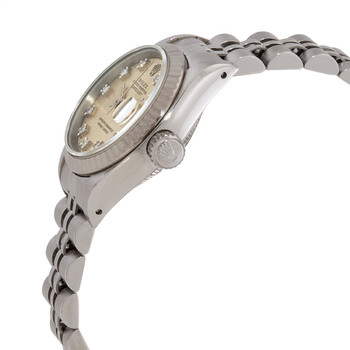 Silver-tone stainless steel case with a silver-tone stainless steel jubilee bracelet. Fixed fluted 18kt white gold bezel. Silver dial with silver-tone hands and diamond hour markers. Minute markers around the outer rim. Dial Type: Analog. Luminescent hands and markers. Date display at the 3 o'clock position. Rolex Calibre 2135 Automatic movement, containing 29 Jewels, bitting at 28800 vph, and has a power reserve of approximately 42 hours. Scratch resistant sapphire crystal. Screw down crown. Solid case back. Round case shape, case size: 26 mm. Fold over clasp. Water resistant at 100 meters / 330 feet. Functions: hours, minutes, seconds, date. Datejust Series. Luxury watch style. Watch label: Swiss Made. Pre-owned Rolex Datejust Automatic Diamond Silver Dial Ladies Watch 69174SDJ.