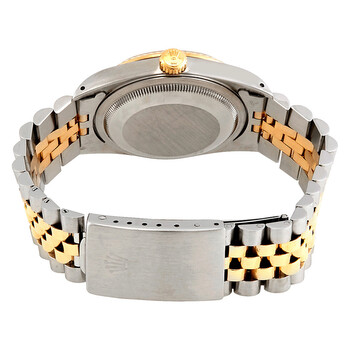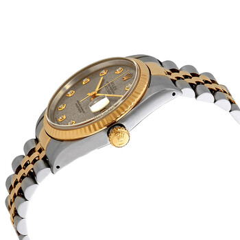 Silver-tone stainless steel case with a silver-tone stainless steel and 18k yellow gold bracelet. Fixed gold-tone 18k yellow gold bezel. Silver dial with gold-tone hands and diamond hour markers. Minute markers around the outer rim. Dial Type: Analog. Date display at the 3 o'clock position. Rolex Calibre 3135 automatic movement. Scratch resistant sapphire crystal. Screw down crown. Solid case back. Round case shape. Case size: 36 mm. Fold over clasp. Water resistant at 100 meters / 330 feet. Functions: date, hour, minute, second. Luxury watch style. Watch label: Swiss Made. Pre-owned Rolex Datejust Automatic Diamond Silver Dial Men's Watch 16233 SJDJ.