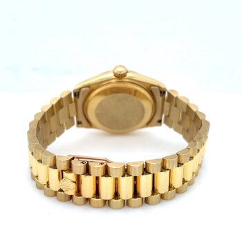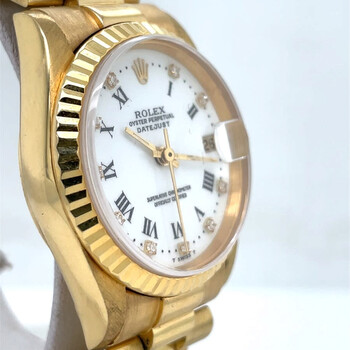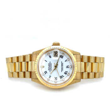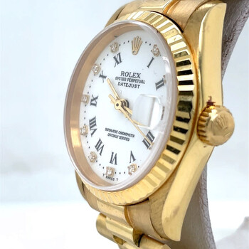 Yellow gold-tone 18kt yellow gold case with a yellow gold-tone 18kt yellow gold president bracelet. Fixed yellow gold-tone 18kt yellow gold bezel. White dial with yellow gold-tone hands and diamond hour markers. Minute markers around the outer rim. Dial Type: Analog. Date display at the 3 o'clock position. Automatic movement. Scratch resistant sapphire crystal. Screw down crown. Solid case back. Round case shape, case size: 31 mm, case thickness: 12 mm. Band width: 14 mm. Crown clasp. Water resistant at 100 meters / 330 feet. Functions: date, hour, minute, second. Datejust Series. Luxury watch style. Watch label: Swiss Made. Pre-owned Rolex Datejust Automatic Diamond White Dial Ladies Watch 68278 WDP.