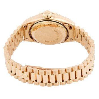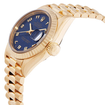 18kt yellow gold case with a yellow gold-tone 18kt yellow gold bracelet. Fixed fluted yellow gold 18kt yellow gold bezel. Bleu dial with gold-tone hands and luminous stick hour markers. Minute markers around the outer rim. Dial Type: Analog. Luminescent hands and markers. Date display at the 3 o'clock position. Rolex Calibre 2135 Automatic movement, containing 29 Jewels, bitting at 28800 vph, and has a power reserve of approximately 42 hours. Scratch resistant sapphire crystal. Screw down crown. Solid case back. Round case shape, case size: 26 mm. Crown clasp. Water resistant at 100 meters / 330 feet. Functions: hours, minutes, seconds, date. Datejust Series. Luxury watch style. Watch label: Swiss Made. Pre-owned Rolex Datejust Automatic Ladies Watch RLX69178CRP.