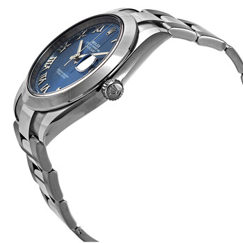 Silver-tone stainless steel case with a silver-tone stainless steel rolex oyster bracelet. Fixed-smooth silver-tone stainless steel bezel. Blue dial with silver-tone hands and Roman numeral hour markers. Minute scale around the inner rim. Dial Type: Analog. Luminescent hands. Date display at the 3 o'clock position. Rolex Calibre 3235 Automatic movement, based upon Rolex 3035, containing 31 Jewels, bitting at 28800 vph, and has a power reserve of approximately 70 hours. Scratch resistant sapphire crystal. Screw down crown. Solid case back. Round case shape, case size: 41 mm. Oysterlock clasp. Water resistant at 100 meters / 330 feet. Functions: date, hour, minute, second. Datejust Series. Luxury watch style. Watch label: Swiss Made. Pre-owned Rolex Datejust Automatic Men's Watch M126300-0017.