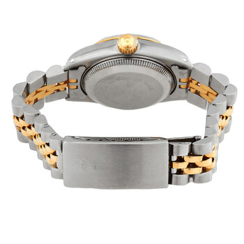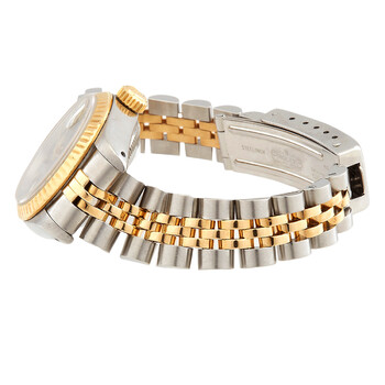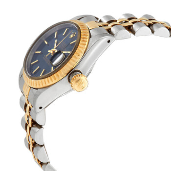 Silver-tone stainless steel case with a 18kt yellow gold and stainless steel jubilee bracelet. Fixed fluted gold-tone 18kt yellow gold bezel. Gold-tone hands and luminous stick hour markers. Minute markers around the outer rim. Dial Type: Analog. Date display at the 3 o'clock position. Chronograph - two sub-dials displaying: 60 second and 30 minute. Rolex Calibre 2135 Automatic movement, containing 29 Jewels, bitting at 28800 vph, and has a power reserve of approximately 42 hours. Scratch resistant sapphire crystal. Screw down crown. Solid case back. Round case shape, case size: 26 mm. Oyster clasp. Water resistant at 100 meters / 330 feet. Functions: hours, minutes, seconds, date. Datejust Series. Luxury watch style. Watch label: Swiss Made. Pre-owned Rolex Datejust Blue Dial Jubilee Bracelet Ladies Watch 69173BLSJ.