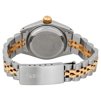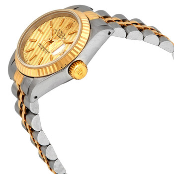 Silver-tone stainless steel case with a two-tone (silver-tone and gold-tone) 18kt yellow gold and stainless steel jubilee bracelet. Fixed fluted 18kt yellow gold bezel. Champagne dial with gold-tone hands and luminous stick hour markers. Minute markers around the outer rim. Dial Type: Analog. Luminescent hands and markers. Date display at the 3 o'clock position. Rolex Calibre 2135 Automatic movement, containing 29 Jewels, bitting at 28800 vph, and has a power reserve of approximately 42 hours. Scratch resistant sapphire crystal. Screw down crown. Solid case back. Round case shape, case size: 26 mm. Band length: 5 inches. Oyster clasp. Water resistant at 100 meters / 330 feet. Functions: date, hour, minute, second, chronometer. Datejust Series. Luxury watch style. Watch label: Swiss Made. Pre-owned Rolex Datejust Champagne Dial Jubilee Bracelet Ladies Watch 69173 CSSJ.
