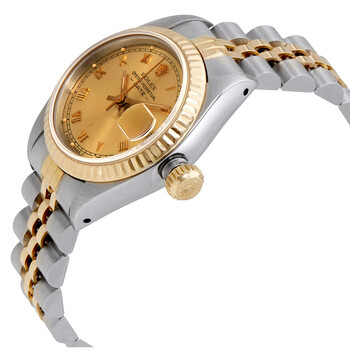 Silver-tone stainless steel case with a two-tone (silver-tone and yellow gold) 18kt yellow gold and stainless steel jubilee bracelet. 18kt yellow gold fixed fluted yellow gold 18k yellow gold bezel. Champagne dial with gold-tone hands and Roman numeral hour markers. Minute markers around the outer rim. Dial Type: Analog. Luminescent hands and markers. Date display at the 3 o'clock position. Rolex Calibre 2135 automatic movement with a 42-hour power reserve. Scratch resistant sapphire crystal. Screw down crown. Solid case back. Round case shape. Case size: 26 mm. Water resistant at 100 meters / 330 feet. Functions: hours, minutes, seconds, date. Luxury watch style. Watch label: Swiss Made. Pre-owned Rolex Datejust Champagne Dial Jubilee Bracelet Ladies Watch 69173CRJ.