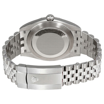 Pre-owned Stainless steel case with a stainless steel Rolex jubilee bracelet. Fixed fluted 18kt white gold bezel. Dark rhodium dial with silver-tone hands and index hour markers. Minute markers around the outer rim. Dial Type: Analog. Date display at the 3 o'clock position. Rolex calibre 3235 automatic movement with a 70-hour power reserve. Scratch resistant sapphire crystal. Screw down crown. Solid case back. Round case shape. Case size: 41 mm. Oysterlock clasp. Water resistant at 100 meters / 330 feet. Functions: date, hour, minute, second. Luxury watch style. Watch label: Swiss Made. Rolex Datejust Dark Rhodium Dial Automatic Men's Jubilee Watch 126334RSJ.