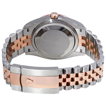 Pre-owned Stainless steel case with a stainless steel Rolex jubilee bracelet with 18kt everose gold links. Fixed 18kt everose gold bezel set with diamonds. Rhodium dial with rose gold hands and Roman numeral hour markers. Minute markers around the outer rim. Dial Type: Analog. Date display at the 3 o'clock position. Rolex calibre 3235 automatic movement, based upon Rolex 3035, containing 31 Jewels, bitting at 28800 vph, and has a power reserve of approximately 70 hours. Scratch resistant sapphire crystal. Screw down crown. Solid case back. Round case shape. Case size: 36 mm. Oyster clasp. Water resistant at 100 meters / 330 feet. Functions: date, hour, minute, second. Datejust 36 Series. Luxury watch style. Watch label: Swiss Made. Rolex Datejust 36 Dark Rhodium Diamond Dial Men's Steel and 18k Everose Gold Jubilee Watch 126281RRDJ.