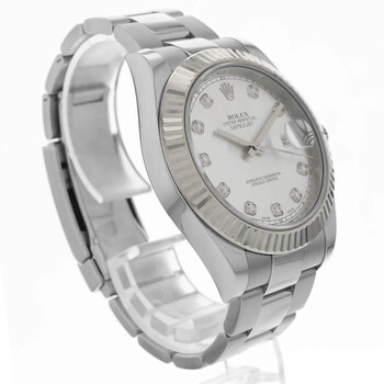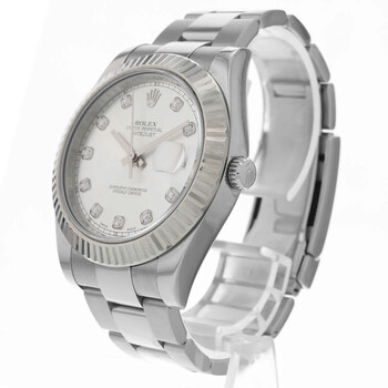 Silver-tone stainless steel case with a silver-tone stainless steel oyster bracelet. Fixed 18kt white gold bezel. Silver-tone dial with silver-tone hands and diamond hour markers. Minute markers around the outer rim. Dial Type: Analog. Date display at the 3 o'clock position. Rolex Calibre 3136 Automatic movement, based upon Rolex 3135, containing 31 Jewels, bitting at 28800 vph, and has a power reserve of approximately 48 hours. Scratch resistant sapphire crystal. Screw down crown. Solid case back. Round case shape, case size: 41 mm. Fold over clasp with a safety release. Water resistant at 100 meters / 330 feet. Functions: date, hour, minute, second, chronometer. Datejust II Series. Luxury watch style. Watch label: Swiss Made. Item Variations: 116334-72210. Pre-owned Rolex Datejust Ii Automatic Chronometer Diamond Silver Dial Men's Watch 116334 SDO.