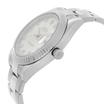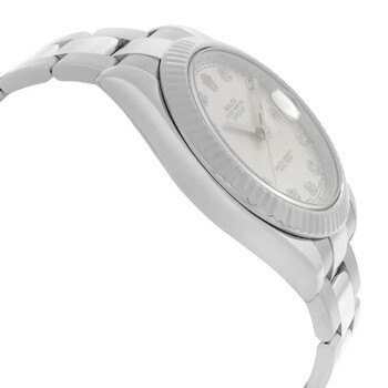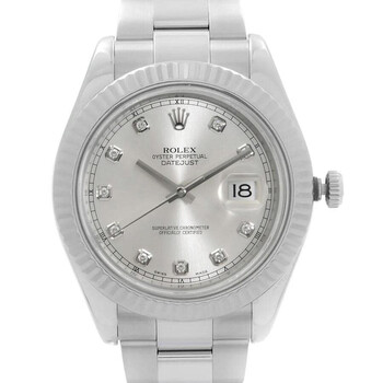 Silver-tone stainless steel case with a silver-tone stainless steel oyster bracelet. Fixed 18kt white gold bezel. Silver-tone dial with silver-tone hands and diamond hour markers. Minute markers around the outer rim. Dial Type: Analog. Date display at the 3 o'clock position. Rolex Calibre 3136 Automatic movement, based upon Rolex 3135, containing 31 Jewels, bitting at 28800 vph, and has a power reserve of approximately 48 hours. Scratch resistant sapphire crystal. Screw down crown. Solid case back. Round case shape, case size: 41 mm, case thickness: 12 mm. Band width: 15.5 mm, band length: 7.5 inches. Fold over clasp. Water resistant at 100 meters / 330 feet. Functions: date, hour, minute, second, chronometer. Datejust II Series. Casual watch style. Watch label: Swiss Made. Item Variations: 116334-72210. Pre-owned Rolex Datejust II Automatic Chronometer Diamond Silver Dial Men's Watch 116334 SDO.