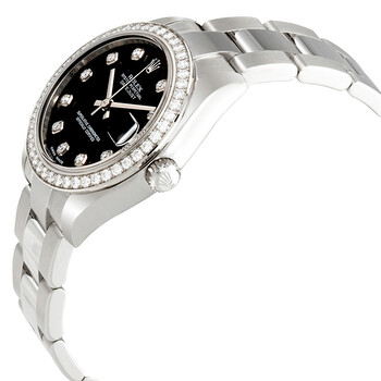 Pre-owned Stainless steel case with a stainless steel Rolex oyster bracelet. Fixed 18kt white gold diamond-set bezel. Black dial with silver-tone hands and diamond hour markers. Dial Type: Analog. Date display at the 3 o'clock position. Rolex calibre 2235 automatic movement with a 48-hour power reserve. Scratch resistant sapphire crystal. Screw down crown. Solid case back. Case size: 31 mm. Round case shape. Oysterlock clasp. Water resistant at 100 meters / 330 feet. Functions: date, hour, minute, second. Luxury watch style. Watch label: Swiss Made. Rolex Datejust Lady 31 Black Dial Stainless Steel Rolex Oyster Automatic Watch 178384BKDO.