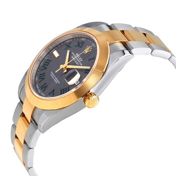 Pre-owned Stainless steel case with a stainless steel Rolex oyster bracelet with 18kt yellow gold center links. Fixed 18kt yellow gold bezel. Slate dial with luminous yellow gold-tone hands and Roman numeral hour markers. Arabic numeral minute markers (at 5 minute intervals). Minute markers around the outer rim. Dial Type: Analog. Luminescent hands. Date display at the 3 o'clock position. Rolex calibre 3235 automatic movement, based upon Rolex 3035, containing 31 Jewels, bitting at 28800 vph, and has a power reserve of approximately 70 hours. Scratch resistant sapphire crystal. Screw down crown. Solid case back. Round case shape. Case size: 41 mm. Oyster clasp. Water resistant at 100 meters / 330 feet. Functions: date, hour, minute, second, chronometer. Datejust 41 Series. Luxury watch style. Watch label: Swiss Made. Item Variations: 126303-0019. Rolex Datejust 41 Slate Dial Automatic Men's Steel and 18kt Yellow Gold Oyster Watch 126303GYRO.
