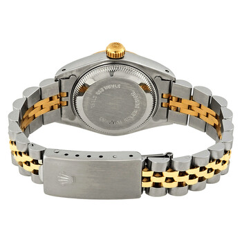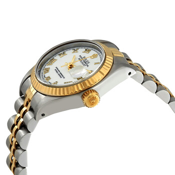 Silver-tone stainless steel case with a two-tone (silver-tone and gold-tone) 18kt yellow gold and stainless steel jubilee bracelet. Fixed fluted yellow gold 18kt yellow gold bezel. White dial with gold-tone hands and Roman numeral hour markers. Minute markers around the outer rim. Dial Type: Analog. Date display at the 3 o'clock position. Rolex Calibre 2135 Automatic movement, containing 29 Jewels, bitting at 28800 vph, and has a power reserve of approximately 42 hours. Scratch resistant sapphire crystal. Screw down crown. Solid case back. Round case shape, case size: 26 mm. Band length: 6 1/2 inches. Fold over clasp. Water resistant at 100 meters / 330 feet. Functions: hours, minutes, seconds, date. Datejust Series. Luxury watch style. Watch label: Swiss Made. Pre-owned Rolex Datejust White Dial Jubilee Bracelet Ladies Watch 69173WRJ 26 mm.
