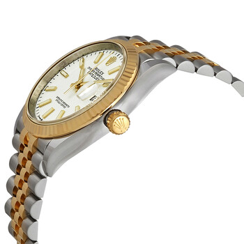 Pre-owned Stainless steel case with a stainless steel Rolex jubilee bracelet with 18kt yellow gold center links. Fixed fluted 18kt yellow gold bezel. White dial with luminous yellow gold hands and index hour markers. Minute markers around the outer rim. Dial Type: Analog. Luminescent hands and markers. Date display at the 3 o'clock position. Rolex calibre 3235 automatic movement, based upon Rolex 3035, containing 31 Jewels, bitting at 28800 vph, and has a power reserve of approximately 70 hours. Scratch resistant sapphire crystal. Screw down crown. Solid case back. Round case shape. Case size: 36 mm. Oyster clasp. Water resistant at 100 meters / 330 feet. Functions: date, hour, minute, second. Datejust 36 Series. Luxury watch style. Watch label: Swiss Made. Rolex Datejust 36 White Dial Men's Steel and 18kt Yellow Gold Jubilee 126233WSJ.
