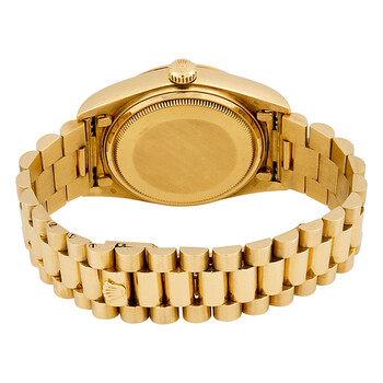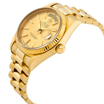 18kt yellow gold case with a 18kt yellow gold bracelet. Fixed fluted 18kt yellow gold bezel. Champagne dial with gold-tone hands and index hour markers. Minute markers around the outer rim. Dial Type: Analog. Luminescent hands and markers. Date display at the 3 o'clock position. Rolex Calibre 3055 automatic movement with a 42-hour power reserve. Scratch resistant sapphire crystal. Screw down crown. Solid case back. Round case shape. Case size: 36 mm. Concealed crown clasp. Water resistant at 100 meters / 330 feet. Functions: date, day, hour, minute, second, chronometer. Luxury watch style. Watch label: Swiss Made. Pre-owned Rolex Day-date 18k Gold Presidential 18038 Champagne Watch.