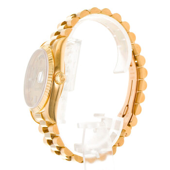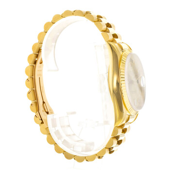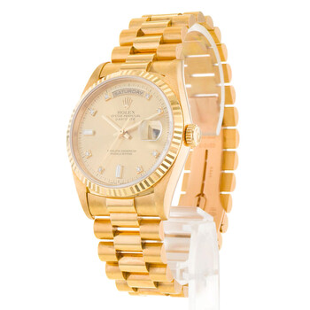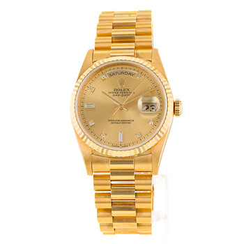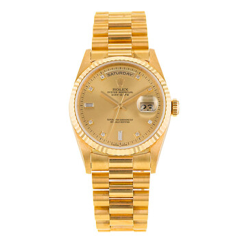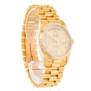 Yellow gold-tone 18kt yellow gold case with a yellow gold-tone 18kt yellow gold president bracelet. Fixed yellow gold-tone 18kt yellow gold bezel. Gold-tone dial with yellow gold-tone hands and diamond hour markers. Minute markers around the outer rim. Dial Type: Analog. Date display at the 3 o'clock position. Rolex Calibre 3155 Automatic movement, based upon Rolex 3055, containing 31 Jewels, bitting at 28800 vph, and has a power reserve of approximately 48 hours. Screw down crown. Solid case back. Round case shape, case size: 36 mm. Crown clasp. Functions: date, day, hour, minute, second, chronometer. Day-date 36 Series. Luxury watch style. Watch label: Swiss Made. Pre-owned Rolex Day-Date 36 Automatic Chronometer Diamond Gold Dial Men's Watch 18238 CDP.
