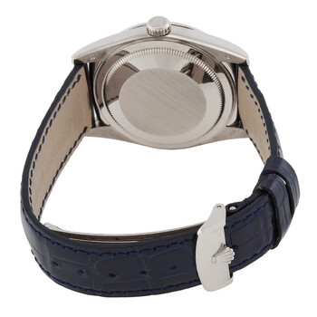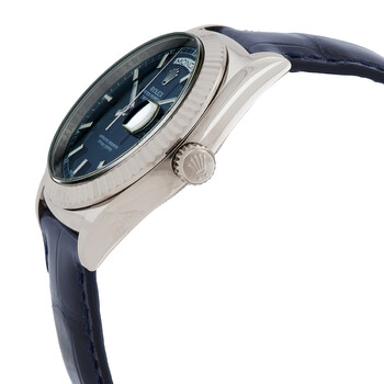 Silver-tone 18kt white gold case with a blue leather strap. Fixed 18kt white gold bezel. Blue dial with silver-tone hands and index hour markers. Minute markers around the outer rim. Dial Type: Analog. Luminescent hands and markers. Date display at the 3 o'clock position. day display at the 12 o'clock position. Rolex Calibre 3155 Automatic movement, based upon Rolex 3055, containing 31 Jewels, bitting at 28800 vph, and has a power reserve of approximately 48 hours. Scratch resistant sapphire crystal. Screw down crown. Solid case back. Round case shape, case size: 36 mm. Deployment buckle clasp. Water resistant at 100 meters / 330 feet. Functions: date, day, hour, minute, second, chronometer. Day-date Series. Luxury watch style. Watch label: Swiss Made. Pre-owned Rolex Day-Date Automatic Chronometer Blue Dial Men's Watch 118139.