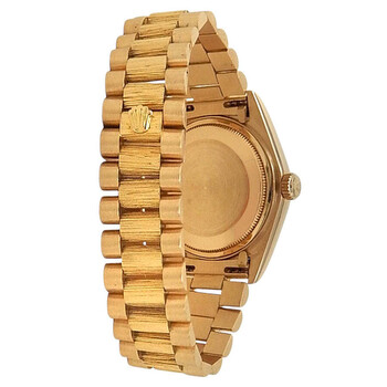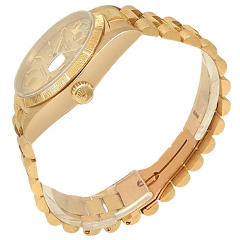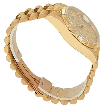 Yellow gold-tone 18kt yellow gold case with a yellow gold-tone 18kt yellow gold president bracelet. Fixed yellow gold-tone 18kt yellow gold bezel. Champagne dial with yellow gold-tone hands and index hour markers. Minute markers around the outer rim. Dial Type: Analog. Date display at the 3 o'clock position. Rolex Calibre 3055 Automatic movement, containing 37 Jewels, bitting at 28800 vph, and has a power reserve of approximately 42 hours. Screw down crown. Solid case back. Round case shape, case size: 36 mm. Crown clasp. Functions: date, day, hour, minute, second, chronometer. Day-date Series. Dress watch style. Watch label: Swiss Made. Pre-owned Rolex Day-Date Automatic Chronometer Champagne Dial Men's Watch 18078 CSP.