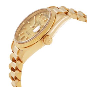 Gold-tone 18kt yellow gold case with a yellow gold-tone 18kt yellow gold president bracelet. Fixed fluted gold-tone 18kt yellow gold bezel. Champagne dial with gold-tone hands and index hour markers. Minute markers around the outer rim. Dial Type: Analog. Luminescent hands and markers. Day of the week and date display at the 12 and 3 o'clock position. Rolex Calibre 3155 Automatic movement, based upon Rolex 3055, containing 31 Jewels, bitting at 28800 vph, and has a power reserve of approximately 48 hours. Scratch resistant sapphire crystal. Screw down crown. Solid case back. Round case shape, case size: 36 mm, case thickness: 12 mm. Band length: 7 1/4 inches. Crown clasp. Water resistant at 100 meters / 330 feet. Functions: date, day, hour, minute, second, chronometer. Day-date Series. Luxury watch style. Watch label: Swiss Made. Pre-owned Rolex Day-Date Automatic Chronometer Champagne Dial Men's Watch 18238 CSP.