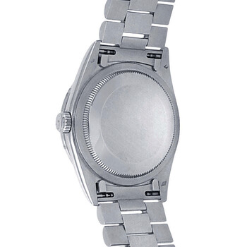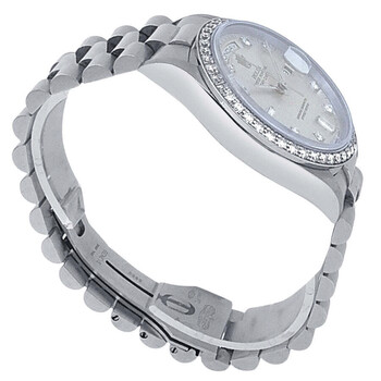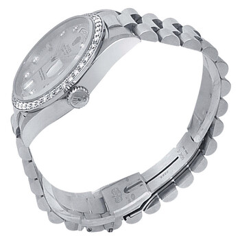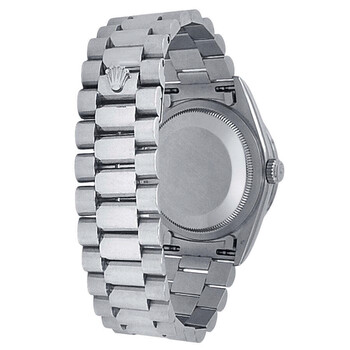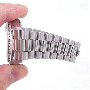 Platinum case with a platinum president bracelet. Fixed bezel with diamond set platinum. Silver-tone dial with silver-tone hands and diamond hour markers. Minute markers around the outer rim. Dial Type: Analog. Date display at the 3 o'clock position. Rolex Calibre 3155 Automatic movement, based upon Rolex 3055, containing 31 Jewels, bitting at 28800 vph, and has a power reserve of approximately 48 hours. Scratch resistant sapphire crystal. Screw down crown. Solid case back. Round case shape, case size: 36 mm. Crown clasp. Water resistant at 100 meters / 330 feet. Functions: date, day, hour, minute, second, chronometer. Day-date Series. Dress watch style. Watch label: Swiss Made. Pre-owned Rolex Day-Date Automatic Chronometer Diamond Silver Dial Men's Watch 18346 SDP.