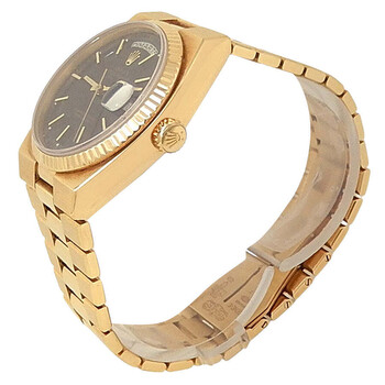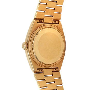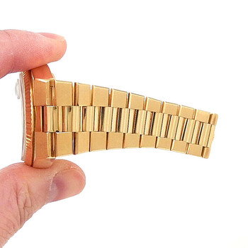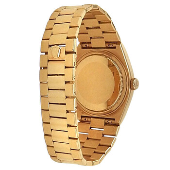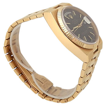 Yellow gold-tone 18kt yellow gold case and bracelet. Fixed yellow gold-tone 18kt yellow gold bezel. Black dial with yellow gold-tone hands and index hour markers. Minute markers around the outer rim. Dial Type: Analog. Date display at the 3 o'clock position. Quartz movement. Screw down crown. Solid case back. Round case shape, case size: 36 mm. Fold over clasp with a safety release. Functions: date, day, hour, minute, second. Day-date Oysterquartz Series. Dress watch style. Watch label: Swiss Made. Pre-owned Rolex Day-Date Oysterquartz Black Dial Men's Watch 19018.