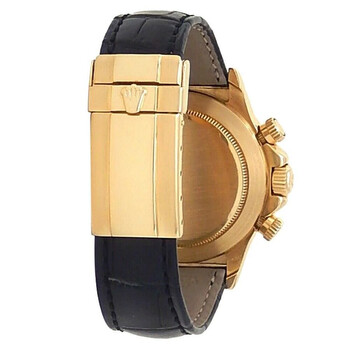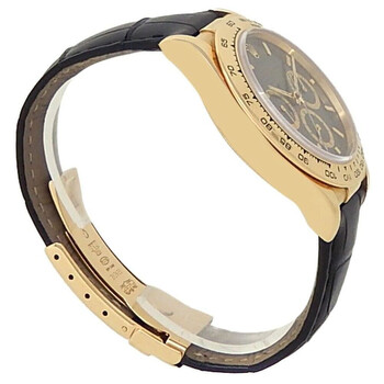 Yellow gold-tone 18kt yellow gold case with a black leather strap. Fixed tachymeter scale yellow gold-tone 18kt yellow gold bezel. Black dial with yellow gold-tone hands and index hour markers. Minute markers around the outer rim. Dial Type: Analog. Chronograph - three sub-dials displaying: 60 second, 30 minute and 12 hour. Rolex Calibre 4030 Automatic movement, based upon Zenith El Primero 11, containing 31 Jewels, bitting at 28800 vph, and has a power reserve of approximately 54 hours. Scratch resistant sapphire crystal. Screw down crown. Solid case back. Round case shape, case size: 40 mm. Fold over clasp. Water resistant at 100 meters / 330 feet. Functions: chronograph, column wheel, hour, minute, small second. Daytona Series. Sport watch style. Watch label: Swiss Made. Pre-owned Rolex Daytona Chronograph Automatic Black Dial Men's Watch 16518 BKSL.