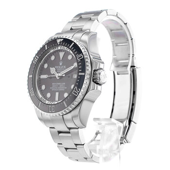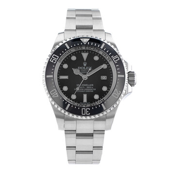 Silver-tone stainless steel case with a silver-tone stainless steel oyster bracelet. Uni-directional rotating black cerachrom bezel. Black dial with silver-tone hands and index hour markers. Minute markers around the outer rim. Dial Type: Analog. Luminescent hands and markers. Date display at the 3 o'clock position. Rolex Calibre 3135 Automatic movement, containing 31 Jewels, bitting at 28800 vph, and has a power reserve of approximately 48 hours. Scratch resistant sapphire crystal. Screw down crown. Solid case back. Round case shape, case size: 44 mm. Fold over clasp with a safety release. Water resistant at 3900 meters / 12800 feet. Functions: date, hour, minute, second, chronometer. Deepsea Series. Luxury watch style. Watch label: Swiss Made. Item Variations: 116660, 116660-BKSO , Rolex-116660, Rolex-116660-BKSO 116660, 116660-BKSO, Rolex. Pre-owned Rolex Deepsea Automatic Chronometer Black Dial Men's Watch 116660 BKSO.