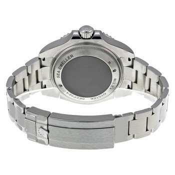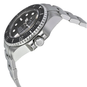 Silver-tone stainless steel case with a silver-tone stainless steel rolex oyster bracelet. Uni-directional rotating stainless steel and cerachrom bezel with a black top ring. Black dial with silver-tone Mercedes-logo, sword, and Breguet-style shape hands and dot hour markers. Minute markers. Dial Type: Analog. Luminescent hands and dial markers. Date display at the 3 o'clock position. Rolex Calibre 3135 Automatic movement, containing 31 Jewels, bitting at 28800 vph, and has a power reserve of approximately 48 hours. Scratch resistant sapphire crystal. Screw down crown. Titanium case back. Round case shape, case size: 44 mm. Band length: 7. Oysterlock clasp. Water resistant at 3900 meters / 12800 feet. Functions: date, hour, minute, second, chronometer. Sea-dweller Series. Dive watch style. Watch label: Swiss Made. Pre-owned Rolex Deepsea Black Dial Stainless Steel Oyster Bracelet Automatic Men's Watch 116660BKSO.