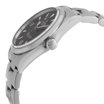 Silver-tone stainless steel case with a silver-tone stainless steel oyster bracelet. Fixed domed silver-tone stainless steel bezel. Black dial with silver-tone Mercedes-logo, sword, and Breguet-style shape hands and stick with Arabic numerals at 3, 6, and 9 o'clock positions hour markers. Minute markers around the outer rim. Dial Type: Analog. Luminescent hands and markers. Rolex Calibre 3000 Automatic movement, based upon Rolex 3035, containing 27 Jewels, bitting at 28800 vph, and has a power reserve of approximately 42 hours. Scratch resistant sapphire crystal. Screw down crown. Solid case back. Round case shape, case size: 36 mm. Band length: 7 1/4 inches. Fold over clasp. Water resistant at 100 meters / 330 feet. Functions: hours, minutes, seconds. Explorer Series. Luxury watch style. Watch label: Swiss Made. Pre-owned Rolex Explorer Automatic Black Dial Men's Watch 14270BKAO.