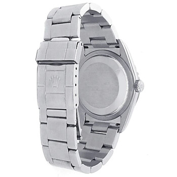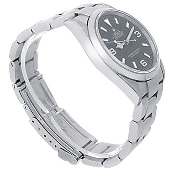 Silver-tone stainless steel case with a silver-tone stainless steel oyster bracelet. Fixed silver-tone stainless steel bezel. Black dial with silver-tone hands and index hour markers. Minute markers around the outer rim. Dial Type: Analog. Luminescent hands and markers. Rolex Calibre 3130 Automatic movement, containing 31 Jewels, bitting at 28800 vph, and has a power reserve of approximately 48 hours. Scratch resistant synthetic sapphire crystal. Screw down crown. Solid case back. Round case shape, case size: 36mm, case thickness: 11.6mm. Double locking deployment clasp. Water resistant at 100 meters / 330 feet. Functions: hour, minute, second, chronometer. Additional Info: 31-jewel chronometer movement. Explorer Series. Luxury watch style. Watch label: Swiss Made. Pre-owned Rolex Explorer Automatic Chronometer Black Dial Men's Watch 114270 BKSO.
