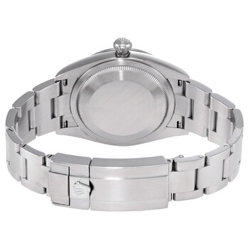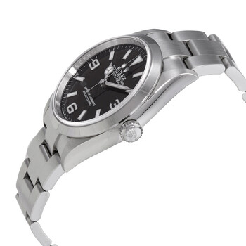 Silver-tone stainless steel case and bracelet. Fixed silver-tone stainless steel bezel. Black dial with luminous silver-tone hands and index hour markers. Arabic numerals appear at the 3, 6 and 9 o'clock positions. Minute markers around the outer rim. Dial Type: Analog. Rolex Calibre 3230 Automatic movement, containing 31 Jewels, bitting at 28800 vph, and has a power reserve of approximately 70 hours. Scratch resistant sapphire crystal. Screw down crown. Solid case back. Round case shape, case size: 36 mm. Band length: 7 inches. Oysterlock clasp. Water resistant at 100 meters / 330 feet. Functions: hour, minute, second, chronometer. Explorer Series. Luxury watch style. Watch label: Swiss Made. Pre-owned Rolex Explorer Automatic Chronometer Black Dial Men's Watch 124270BKASO.