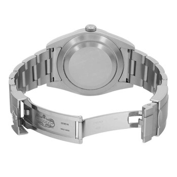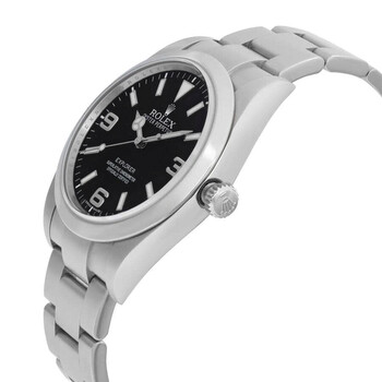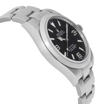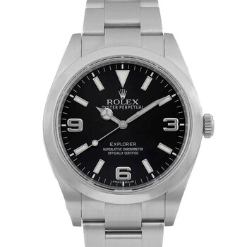 Grey stainless steel case with a silver-tone stainless steel oyster bracelet. Fixed silver-tone stainless steel bezel. Black dial with silver-tone hands and Arabic numeral hour markers. Minute markers around the outer rim. Dial Type: Analog. Luminescent hands and markers. Rolex Calibre 3132 Automatic movement, based upon Rolex 3130, containing 31 Jewels, bitting at 28800 vph, and has a power reserve of approximately 48 hours. Scratch resistant sapphire crystal. Screw down crown. Solid case back. Round case shape, case size: 39 mm, case thickness: 11 mm. Band width: 15 mm, band length: 7.5 inches. Fold over clasp. Water resistant at 100 meters / 330 feet. Functions: hour, minute, second, chronometer. Explorer Series. Luxury watch style. Watch label: Swiss Made. Item Variations: 214270-0003. Pre-owned Rolex Explorer Automatic Chronometer Black Dial Men's Watch 214270 BKAO.