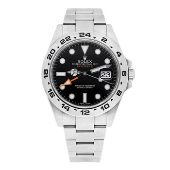 Silver-tone stainless steel case with a silver-tone stainless steel oyster bracelet. Fixed silver-tone stainless steel bezel. Black dial with silver-tone hands and index hour markers. Minute markers around the outer rim. Dial Type: Analog. Luminescent hands and markers. Date display at the 3 o'clock position. Rolex Calibre 3187 Automatic movement, containing 25 Jewels, bitting at 28800 vph, and has a power reserve of approximately 50 hours. Scratch resistant sapphire crystal. Screw down crown. Solid case back. Round case shape, case size: 42 mm. Fold over clasp. Water resistant at 100 meters / 330 feet. Functions: date, hour, minute, second. Explorer II Series. Luxury watch style. Watch label: Swiss Made. Item Variations: m216570-0002, 216570-0002. Pre-owned Rolex Explorer II Automatic Black Dial Men's Watch 216570 BKSO.