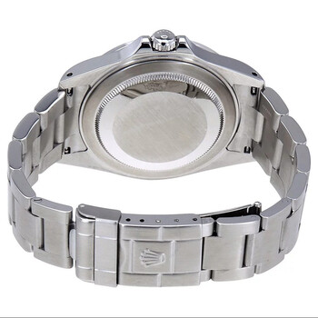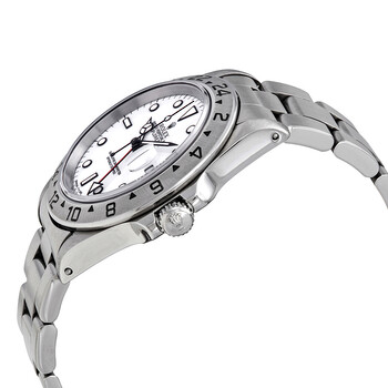 Silver-tone stainless steel case with a silver-tone stainless steel rolex oyster bracelet. Fixed - 24 hour engraved silver-tone stainless steel bezel. White dial with black Mercedes-logo, sword, and Breguet-style shape hands and index hour markers. Minute markers around the outer rim. Dial Type: Analog. Luminescent hands and dial markers. Date display at the 3 o'clock position. Rolex Calibre 3185 Automatic movement, based upon Rolex 3135, bitting at 28800 vph, and has a power reserve of approximately 50 hours. Scratch resistant sapphire crystal. Screw down crown. Solid case back. Round case shape, case size: 40 mm. Oysterlock clasp. Water resistant at 100 meters / 330 feet. Functions: GMT, second time zone, date, hour, minute, second, chronometer. Explorer II Series. Luxury watch style. Watch label: Swiss Made. Pre-owned Rolex Explorer II Automatic Chronometer White Dial Men's Watch 16570 WSO.