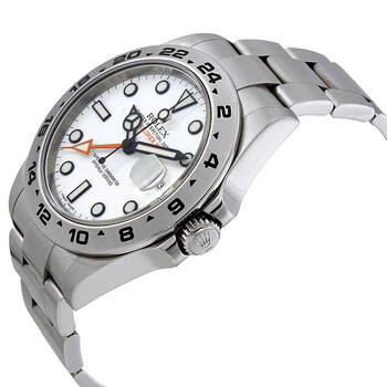 Silver-tone stainless steel case with a silver-tone stainless steel rolex oyster bracelet. Fixed - 24 hour engraved silver-tone stainless steel bezel. White dial with luminous black Mercedes-logo, sword, and Breguet-style shape hands and dot hour markers. Minute markers around the outer rim. Dial Type: Analog. Luminescent hands and markers. Date display at the 3 o'clock position. Rolex Calibre 3187 Automatic movement, containing 25 Jewels, bitting at 28800 vph, and has a power reserve of approximately 50 hours. Scratch resistant sapphire crystal. Screw down crown. Solid case back. Round case shape, case size: 42 mm, case thickness: 13 mm. Band width: 15 mm, band length: 7 1/2 inches. Oysterlock clasp. Water resistant at 100 meters / 330 feet. Functions: GMT, second time zone, date, hour, minute, second, chronometer. Explorer II Series. Luxury watch style. Watch label: Swiss Made. Pre-Owned Rolex Explorer II White Dial Stainless Steel Rolex Oyster Automatic Men's Watch 216570WSO.