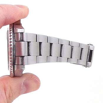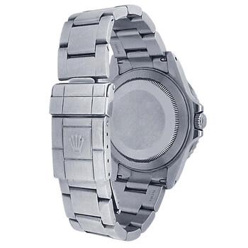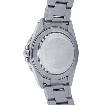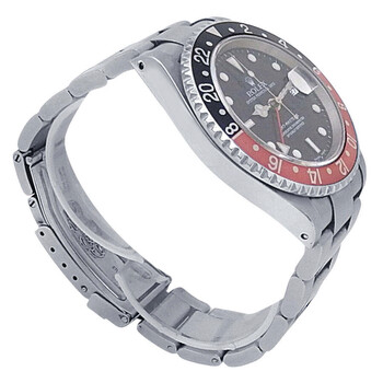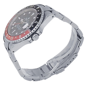 Silver-tone stainless steel case with a silver-tone stainless steel oyster bracelet. Bi-directional rotating stainless steel bezel. Black dial with silver-tone hands and index hour markers. Minute markers around the outer rim. Dial Type: Analog. Luminescent hands and markers. Date display at the 3 o'clock position. Automatic movement. Screw down crown. Solid case back. Round case shape, case size: 40 mm. Fold over clasp with a safety release. Water resistant at 100 meters / 330 feet. Functions: date, hour, minute, second. Gmt-master II Series. Sport watch style. Watch label: Swiss Made. Pre-owned Rolex GMT-Master II Automatic Black Dial Men's Watch 16710 BKSO.