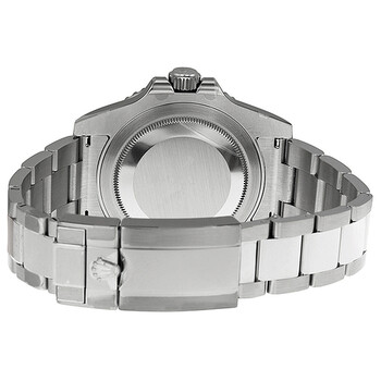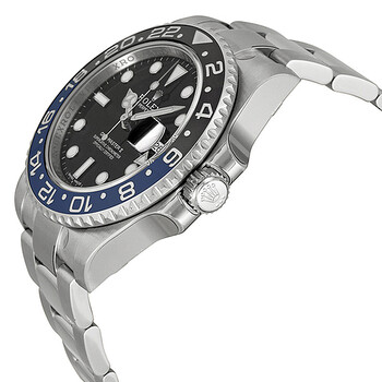 Silver-tone stainless steel case with a silver-tone stainless steel oyster bracelet. Bi-directional GMT markings black and blue (Batman) stainless steel and ceramic bezel. Black dial with silver-tone Mercedes-logo, sword, and Breguet-style shape hands and dot hour markers. Minute markers around the outer rim. Dial Type: Analog. Luminescent superluminova luminescent. Date display at the 3 o'clock position. Rolex Calibre 3186 Automatic movement, containing 31 Jewels, bitting at 28800 vph, and has a power reserve of approximately 50 hours. Scratch resistant sapphire crystal. Screw locked crown. Solid case back. Round case shape, case size: 40 mm. Band length: 7.5 inches. Oysterlock clasp. Water resistant at 100 meters / 330 feet. Functions: GMT, second time zone, date, hour, minute, second, chronometer. Gmt-master II Series. Dress watch style. Watch label: Swiss Made. Pre-owned Rolex GMT-Master II Automatic Chronometer Black Dial Men's Watch 116710BLNR.