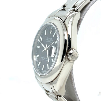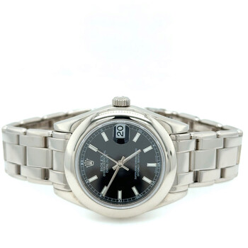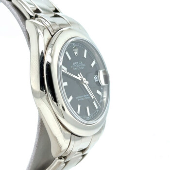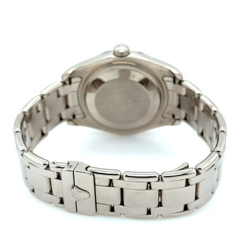 18kt white gold case with a 18kt white gold pearlmaster bracelet. Fixed 18kt white gold bezel. Black dial with silver-tone hands and index hour markers. Minute markers around the outer rim. Dial Type: Analog. Luminescent hands and markers. Date display at the 3 o'clock position. Rolex Calibre 2235 Automatic movement, containing 31 Jewels, bitting at 28800 vph, and has a power reserve of approximately 48 hours. Scratch resistant sapphire crystal. Screw down crown. Solid case back. Round case shape, case size: 34 mm, case thickness: 11 mm. Band width: 20 mm. Crown clasp. Water resistant at 100 meters / 330 feet. Functions: date, hour, minute, second. Lady Datejust Series. Luxury watch style. Watch label: Swiss Made. Pre-owned Rolex Lady Datejust Automatic Black Dial Ladies Watch 81209 BKSPM.
