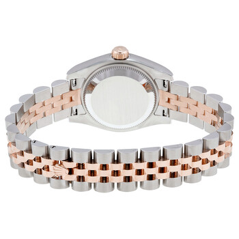Silver-tone stainless steel case with a two-tone (silver-tone and rose gold-tone) stainless steel and 18kt rose gold rolex jubilee bracelet. Fixed fluted rose gold-tone 18kt rose gold bezel. Pink dial with rose gold-tone hands and Roman hour markers. Minute markers around the outer rim. Dial Type: Analog. Date display at the 3 o'clock position. Rolex Calibre 2235 Automatic movement, containing 31 Jewels, bitting at 28800 vph, and has a power reserve of approximately 48 hours. Scratch resistant sapphire crystal. Screw down crown. Solid case back. Round case shape, case size: 26 mm. Fold over clasp with a safety release. Water resistant at 100 meters / 330 feet. Functions: date, hour, minute, second, chronometer. Additional Info: open papers, circa 2006. Lady Datejust Series. Luxury watch style. Watch label: Swiss Made. Pre-owned Rolex Lady Datejust Pink Dial Ladies Watch 179171PRJ.