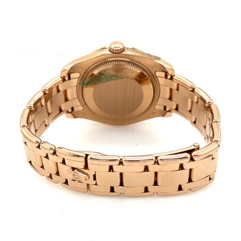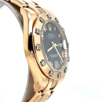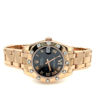 Rose gold-tone 18kt rose gold case with a rose gold-tone 18kt rose gold pearlmaster bracelet. Fixed rose gold-tone bezel with diamond set 18kt rose gold. Blue dial with rose gold-tone hands and Roman numeral hour markers. Dial Type: Analog. Date display at the 3 o'clock position. Rolex Calibre 2235 Automatic movement, containing 31 Jewels, bitting at 28800 vph, and has a power reserve of approximately 48 hours. Scratch resistant sapphire crystal. Screw down crown. Solid case back. Round case shape, case size: 34 mm, case thickness: 10 mm. Band width: 15 mm. Crown clasp. Water resistant at 100 meters / 330 feet. Functions: date, hour, minute, second. Lady-datejust Series. Luxury watch style. Watch label: Swiss Made. Pre-owned Rolex Lady-Datejust Automatic Diamond Blue Dial Ladies Watch 81315 BLRPM.