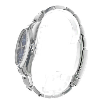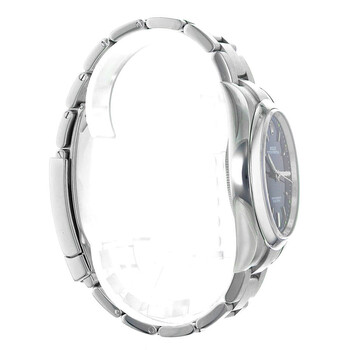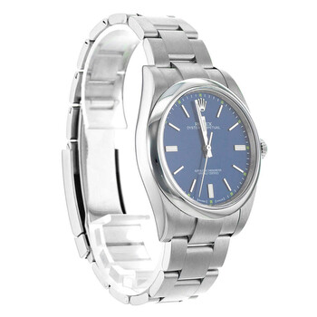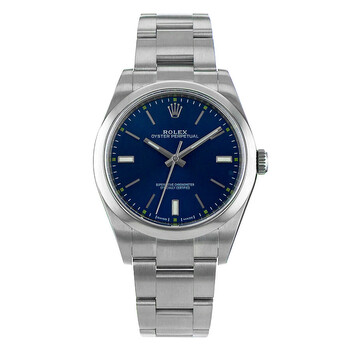 Silver-tone stainless steel case with a silver-tone stainless steel oyster bracelet. Fixed silver-tone stainless steel bezel. Blue dial with silver-tone hands and index hour markers. Minute markers around the outer rim. Dial Type: Analog. Luminescent hands and markers. Rolex Calibre 3132 Automatic movement, based upon Rolex 3130, containing 31 Jewels, bitting at 28800 vph, and has a power reserve of approximately 48 hours. Scratch resistant sapphire crystal. Screw down crown. Solid case back. Round case shape, case size: 39 mm. Fold over clasp with a safety release. Water resistant at 100 meters / 330 feet. Functions: hour, minute, second, chronometer. Oyster Perpetual 39 Series. Luxury watch style. Watch label: Swiss Made. Item Variations: 114300-70400, 114300-0003. Pre-owned Rolex Oyster Perpetual 39 Automatic Chronometer Blue Dial Men's Watch 114300 BLSO.