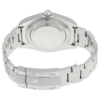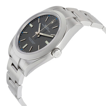 Silver-tone stainless steel case with a silver-tone stainless steel rolex oyster bracelet. Fixed domed silver-tone stainless steel bezel. Dark rhodium dial with luminous silver-tone hands and index hour markers. Minute markers around the outer rim. Dial Type: Analog. Luminescent hands and markers. Rolex Calibre 3132 Automatic movement, based upon Rolex 3130, containing 31 Jewels, bitting at 28800 vph, and has a power reserve of approximately 48 hours. Scratch resistant sapphire crystal. Screw down crown. Solid case back. Round case shape, case size: 39 mm. Band length: 6 1/2 inches. Oysterlock clasp. Water resistant at 100 meters / 330 feet. Functions: hour, minute, second, chronometer. Oyster Perpetual Series. Luxury watch style. Watch label: Swiss Made. Pre-owned Rolex Oyster Perpetual 39 Automatic Chronometer Men's Watch 114300DRSO.