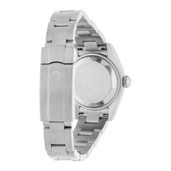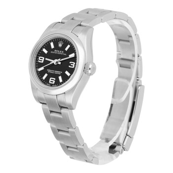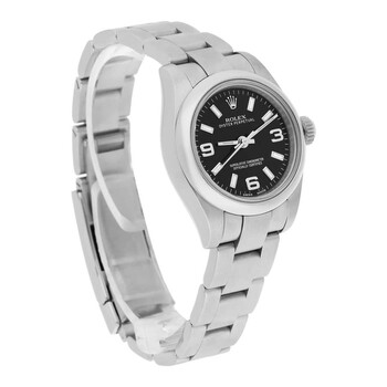 Silver-tone stainless steel case with a silver-tone stainless steel oyster bracelet. Fixed silver-tone stainless steel bezel. Black dial with silver-tone hands and Arabic numeral & index hour markers. Minute markers around the outer rim. Dial Type: Analog. Luminescent hands and markers. Rolex Calibre 2230 Automatic movement, containing 31 Jewels, bitting at 28800 vph, and has a power reserve of approximately 42 hours. Scratch resistant sapphire crystal. Screw down crown. Solid case back. Round case shape, case size: 26 mm. Fold over clasp. Water resistant at 100 meters / 330 feet. Functions: hour, minute, second. Additional Info: year of production: unknown. Oyster Perpetual Series. Casual watch style. Watch label: Swiss Made. Pre-owned Rolex Oyster Perpetual Automatic Black Dial Ladies Watch 176200 BKSAO.