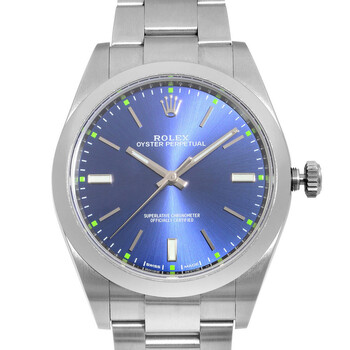 Silver-tone stainless steel case with a silver-tone stainless steel oyster bracelet. Fixed silver-tone stainless steel bezel. Blue dial with silver-tone hands and index hour markers. Minute markers around the outer rim. Dial Type: Analog. Luminescent hands and markers. Rolex Calibre 3132 Automatic movement, based upon Rolex 3130, containing 31 Jewels, bitting at 28800 vph, and has a power reserve of approximately 48 hours. Scratch resistant sapphire crystal. Screw down crown. Solid case back. Round case shape, case size: 39 mm, case thickness: 11 mm. Band width: 15.5 mm, band length: 7 inches. Fold over clasp. Water resistant at 100 meters / 330 feet. Functions: hour, minute, second, chronometer. Oyster Perpetual Series. Luxury watch style. Watch label: Swiss Made. Item Variations: 114300-70400, 114300-0003. Pre-owned Rolex Oyster Perpetual Automatic Chronometer Blue Dial Men's Watch 114300 BLSO.