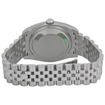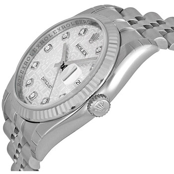 Silver-tone stainless steel case with a silver-tone stainless steel rolex jubilee bracelet. Fixed fluted 18kt white gold bezel. Silver jubilee dial with silver-tone hands and diamond hour markers. Dial Type: Analog. Date display at the 3 o'clock position. Rolex Calibre 3135 Automatic movement, containing 31 Jewels, bitting at 28800 vph, and has a power reserve of approximately 48 hours. Scratch resistant sapphire crystal. Screw down crown. Solid case back. Round case shape, case size: 36 mm. Band length: 6 3/4 inches. Deployment clasp. Water resistant at 100 meters / 330 feet. Functions: date, hour, minute, second, chronometer. Oyster Perpetual Series. Luxury watch style. Watch label: Swiss Made. Pre-owned Rolex Oyster Perpetual Automatic Chronometer Diamond Men's Watch 116234SJDJ.