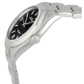 Pre-owned Stainless steel case with a stainless steel Rolex oyster bracelet. Fixed domed stainless steel bezel. Black dial with silver-tone hands and pink index hour markers. Arabic numerals mark the 3, 6 and 9 o'clock positions. The Rolex logo appears at the 12 o'clock position. Dial Type: Analog. Luminescent hands and dial markers. Rolex calibre 3130 automatic movement with a 48-hour power reserve. Scratch resistant sapphire crystal. Screw down crown. Solid case back. Case size: 36 mm. Round case shape. Oysterlock clasp. Water resistant at 100 meters / 330 feet. Functions: hour, minute, second. Luxury watch style. Watch label: Swiss Made. Item Variations: 116000. Rolex Oyster Perpetual 36 mm Black Dial Stainless Steel Rolex Oyster Automatic Men's Watch 116000BKAPSO.