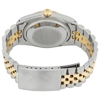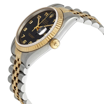 Silver-tone stainless steel case with a two-tone (silver-tone and gold-tone) stainless steel and 18kt yellow gold rolex jubilee bracelet. Fixed fluted yellow 18kt gold bezel. Black dial with luminous yellow gold-tone hands and Arabic numeral hour markers. Minute markers around the outer rim. Dial Type: Analog. Luminescent hands and markers. Date display at the 3 o'clock position. Rolex Calibre 3135 automatic movement with a 50-hour power reserve. Scratch resistant sapphire crystal. Screw down crown. Solid case back. Round case shape. Case size: 36 mm. Hidden deployment clasp. Water resistant at 100 meters / 330 feet. Functions: date, hour, minute, second, chronometer. Luxury watch style. Watch label: Swiss Made. Pre-owned Rolex Oyster Perpetual Datejust 36 Automatic Chronometer Black Dial Men's Watch 16233 BKAJ.