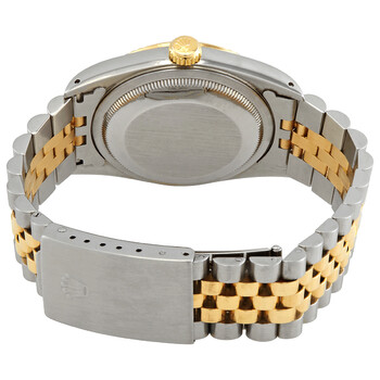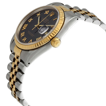 Silver-tone stainless steel case with a two-tone (silver-tone and gold-tone) stainless steel and 18kt yellow gold rolex jubilee bracelet. Fixed fluted yellow 18kt gold bezel. Black dial with luminous yellow gold-tone hands and Roman numeral hour markers. Minute markers around the outer rim. Dial Type: Analog. Luminescent hands and markers. Date display at the 3 o'clock position. Rolex Calibre 3135 Automatic movement, containing 31 Jewels, bitting at 28800 vph, and has a power reserve of approximately 48 hours. Scratch resistant sapphire crystal. Screw down crown. Solid case back. Round case shape. Case size: 36 mm. Hidden deployment clasp. Water resistant at 100 meters / 330 feet. Functions: date, hour, minute, second, chronometer. Luxury watch style. Watch label: Swiss Made. Pre-owned Rolex Oyster Perpetual Datejust 36 Automatic Chronometer Black Dial Men's Watch 16233 BKRJ.
