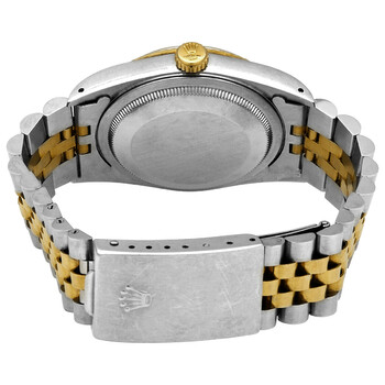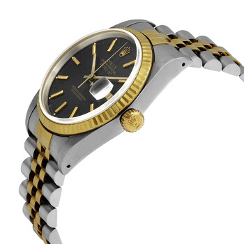 Silver-tone stainless steel case with a two-tone (silver-tone and gold-tone) stainless steel and 18kt yellow gold rolex jubilee bracelet. Fixed fluted yellow 18kt gold bezel. Black tapesty dial with luminous yellow gold-tone hands and index hour markers. Minute markers around the outer rim. Dial Type: Analog. Luminescent hands and markers. Date display at the 3 o'clock position. Rolex Calibre 3135 Automatic movement, containing 31 Jewels, bitting at 28800 vph, and has a power reserve of approximately 48 hours. Scratch resistant sapphire crystal. Screw down crown. Solid case back. Round case shape, case size: 36 mm. Hidden deployment clasp. Water resistant at 100 meters / 330 feet. Functions: date, hour, minute, second, chronometer. Oyster Perpetual Datejust 36 Series. Luxury watch style. Watch label: Swiss Made. Pre-owned Rolex Oyster Perpetual Datejust 36 Automatic Chronometer Men's Watch 16233 BKTSJ.